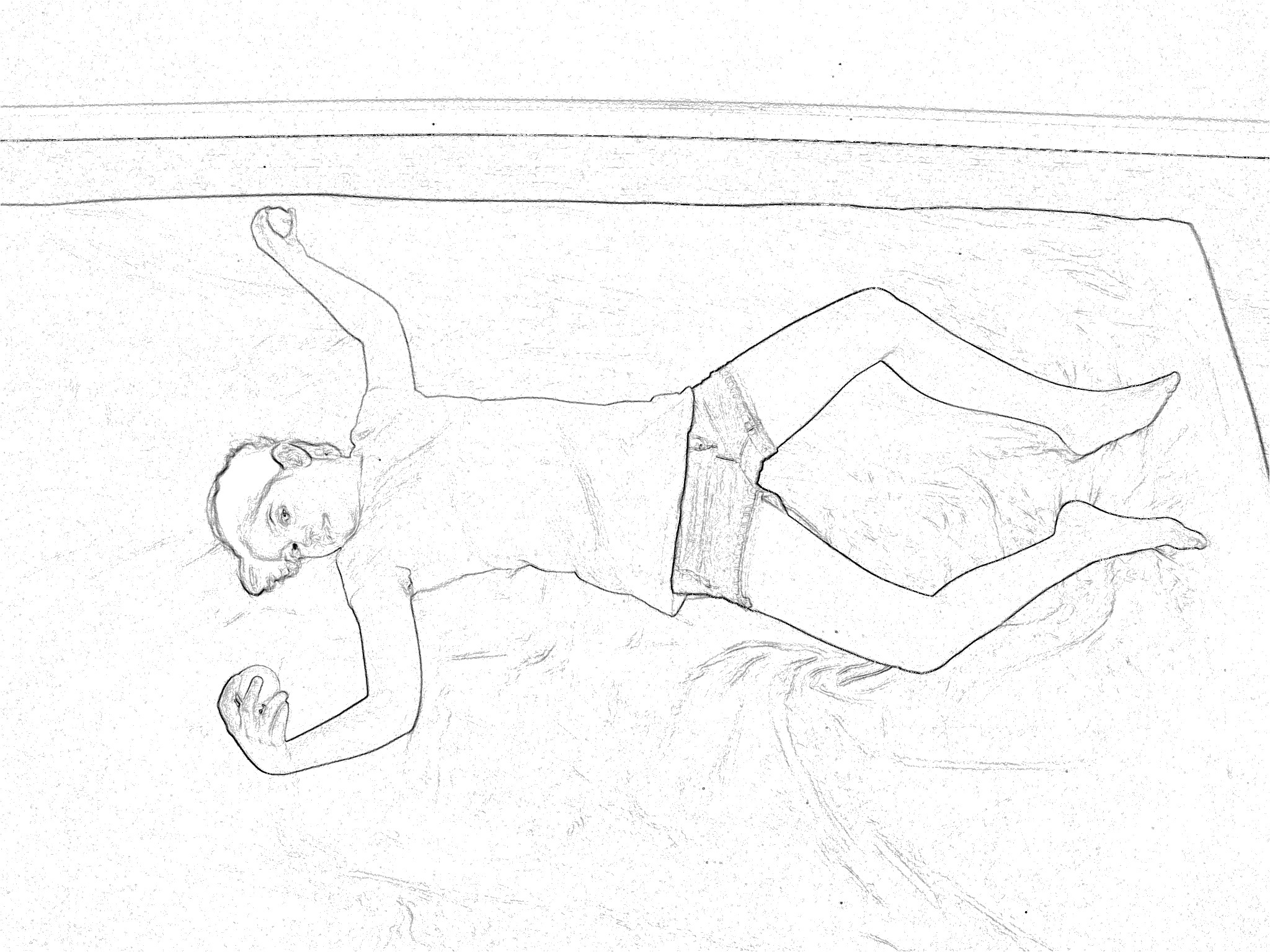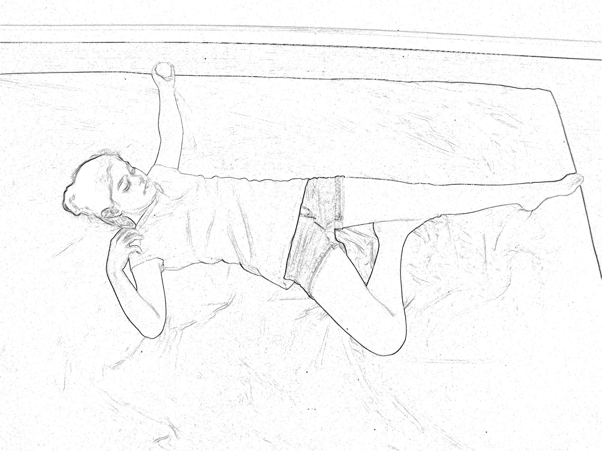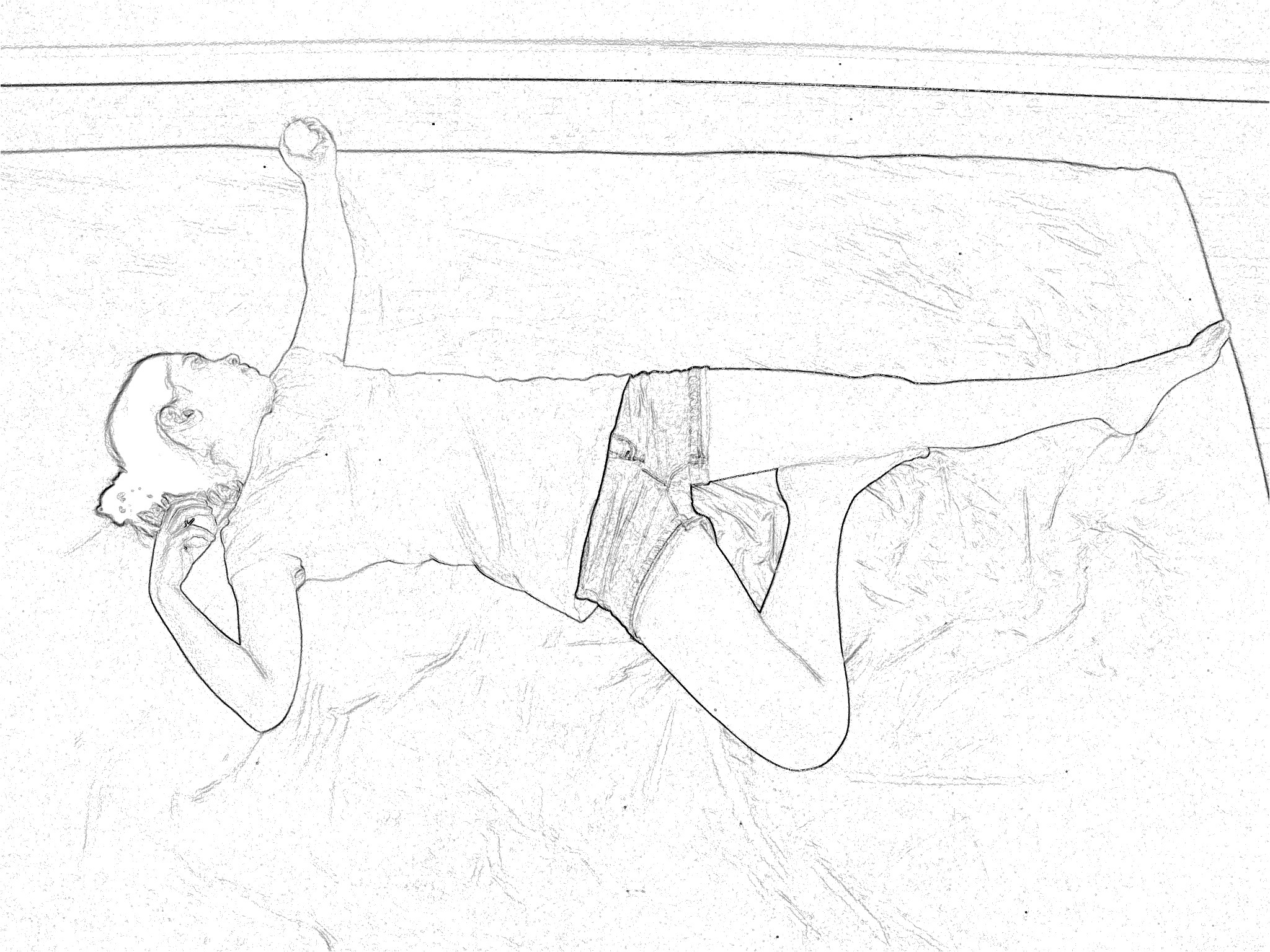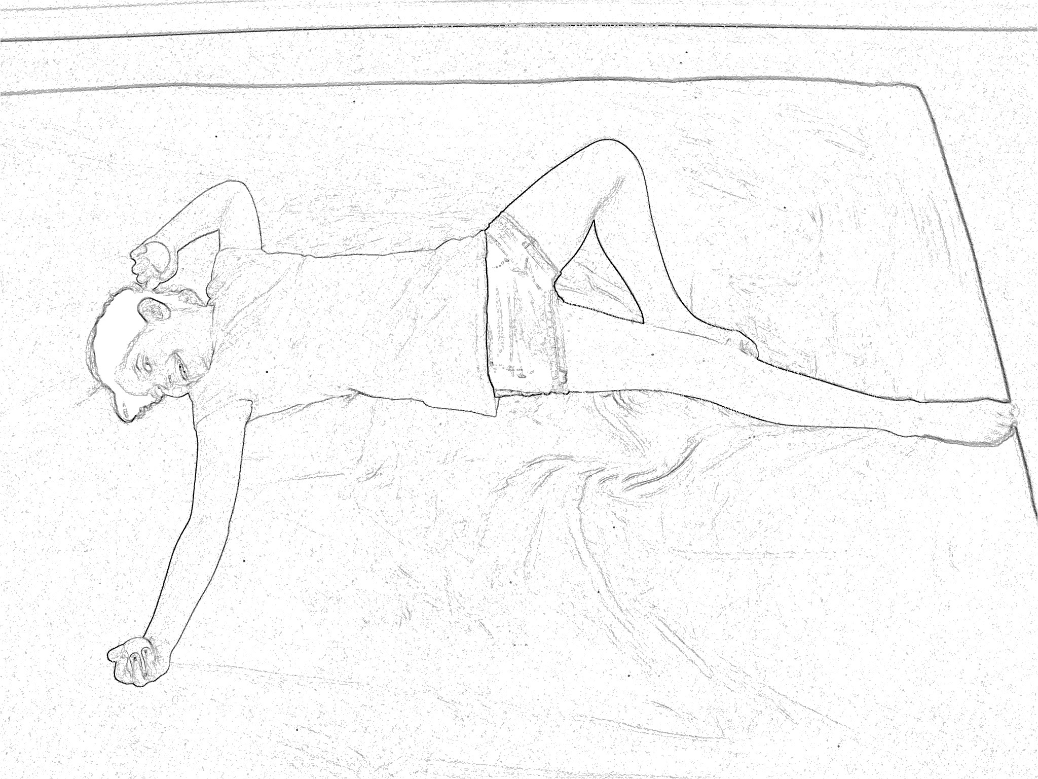 - Lie on back with the right arm straight out to side and the right leg straight down. Left arm should be bent so that hand is near the head. Left leg should be bent (leg on floor) so that foot is resting near the opposite knee. Head is turned to the right, ear on the floor, eyes looking at right hand (Figure 1).
