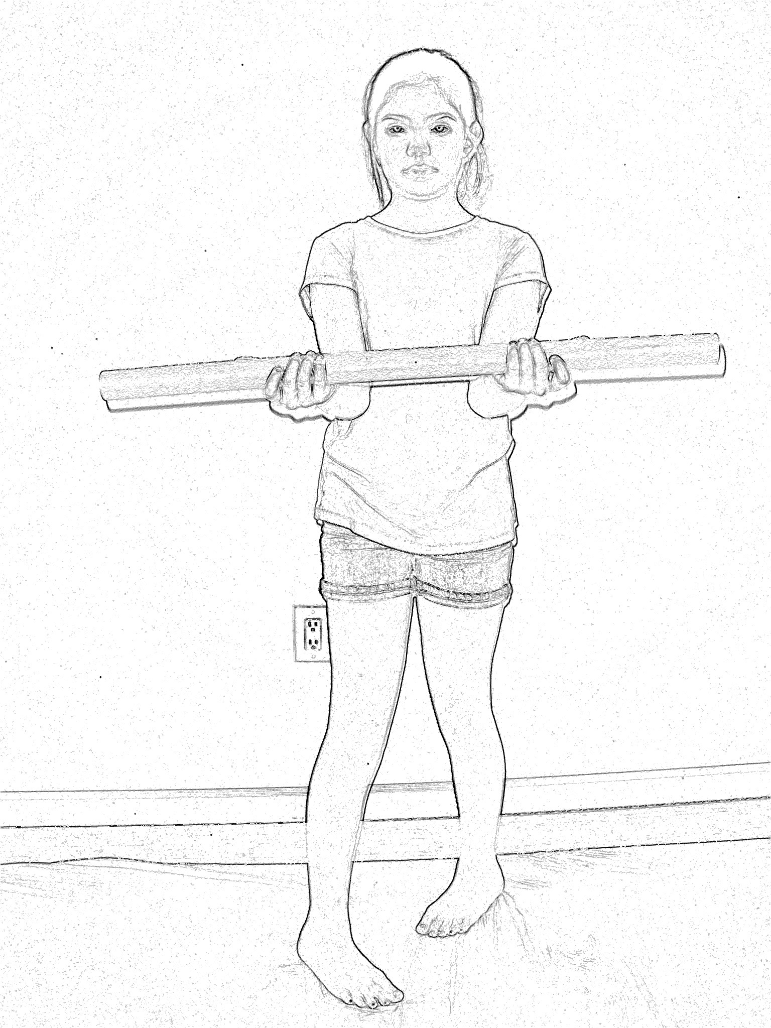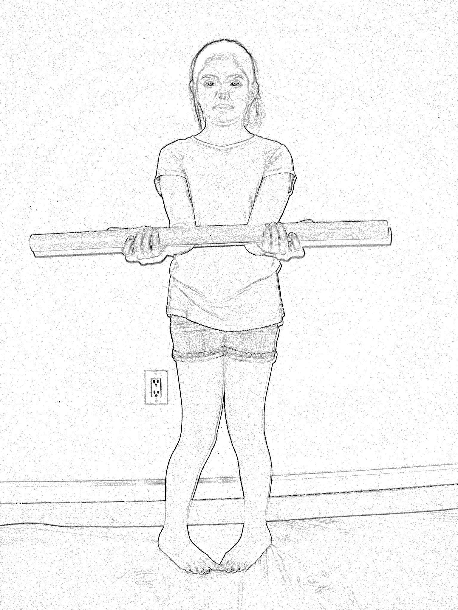 1. Stand in pigeon position, feet inward, holding the stick with the thumbs pointed outward (Figure 3).